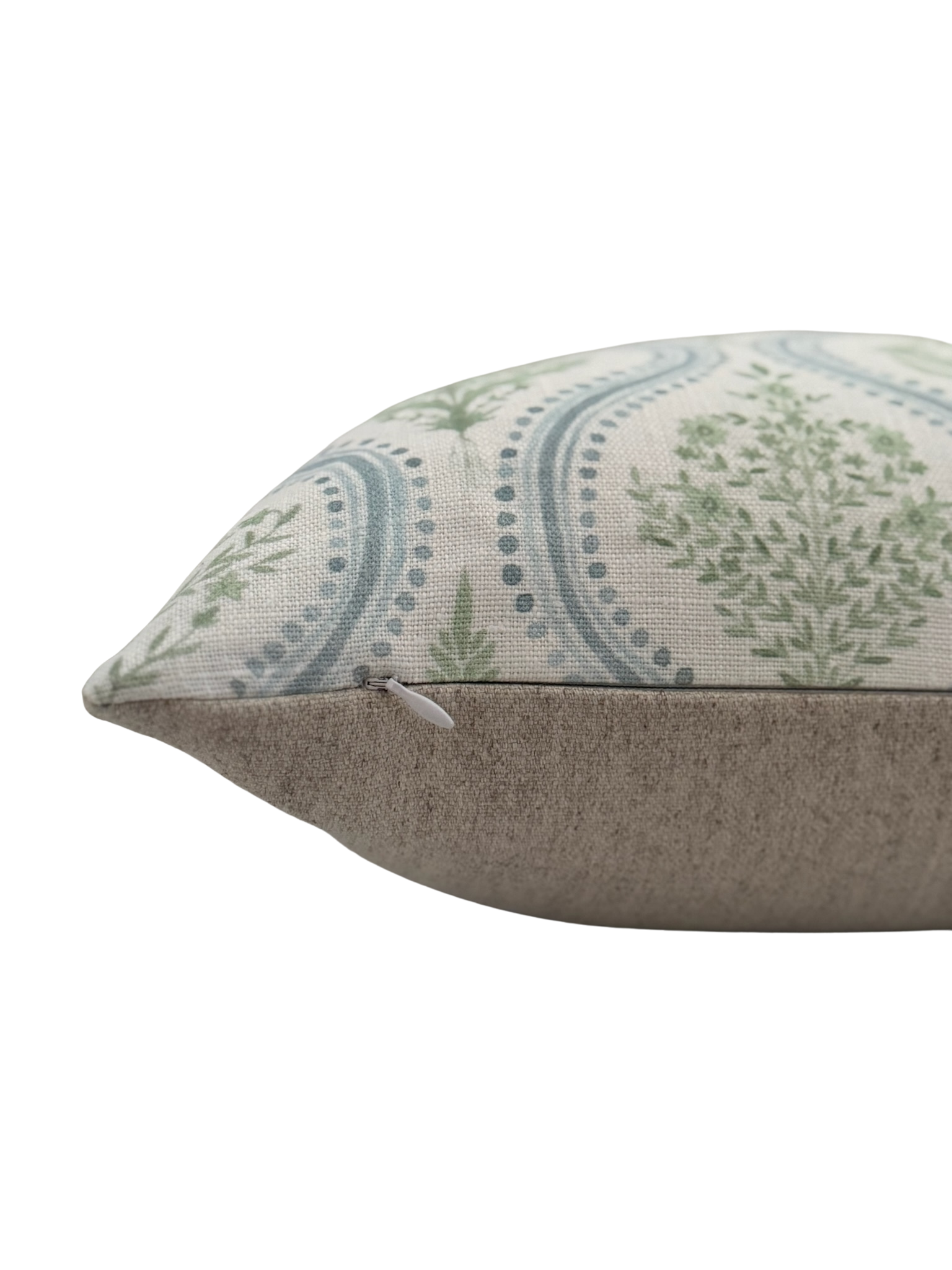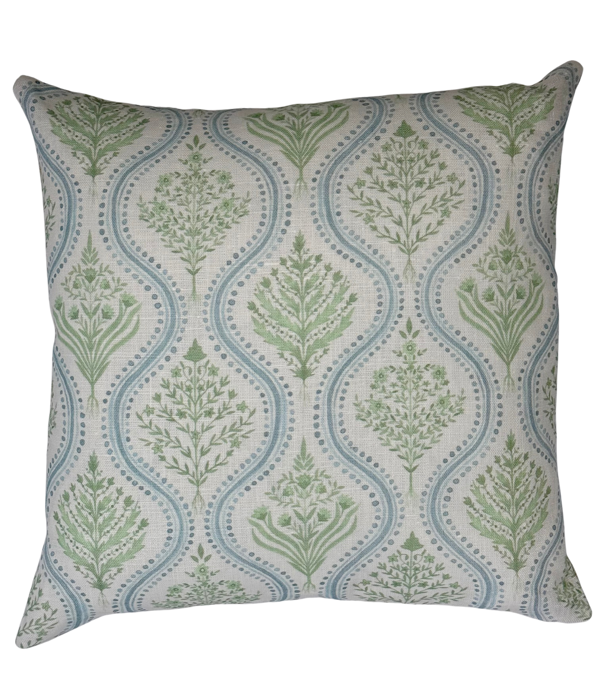 This fabric features a pale green and light blue trellis floral pattern on a white background. It is meticulously crafted from Belgian linen fabric, with a natural off-white linen backing. Invisible zipper, serged edges.