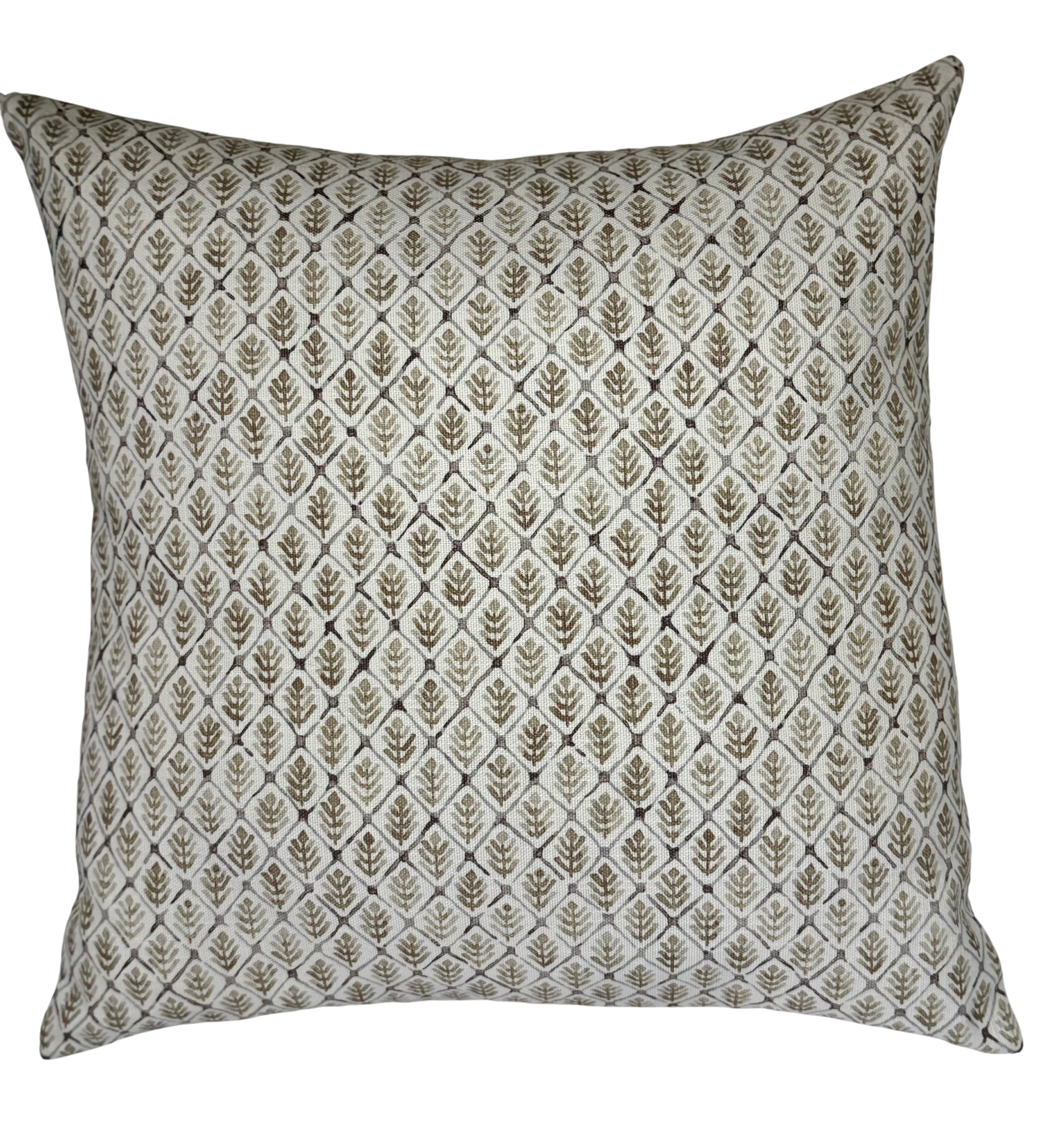 This fabric features a grey diamond and olive taupe stem-like design atop an off white background. It is meticulously handcrafted with a high-quality cotton blend and a natural off-white linen backing. Invisible zipper, serged edges.