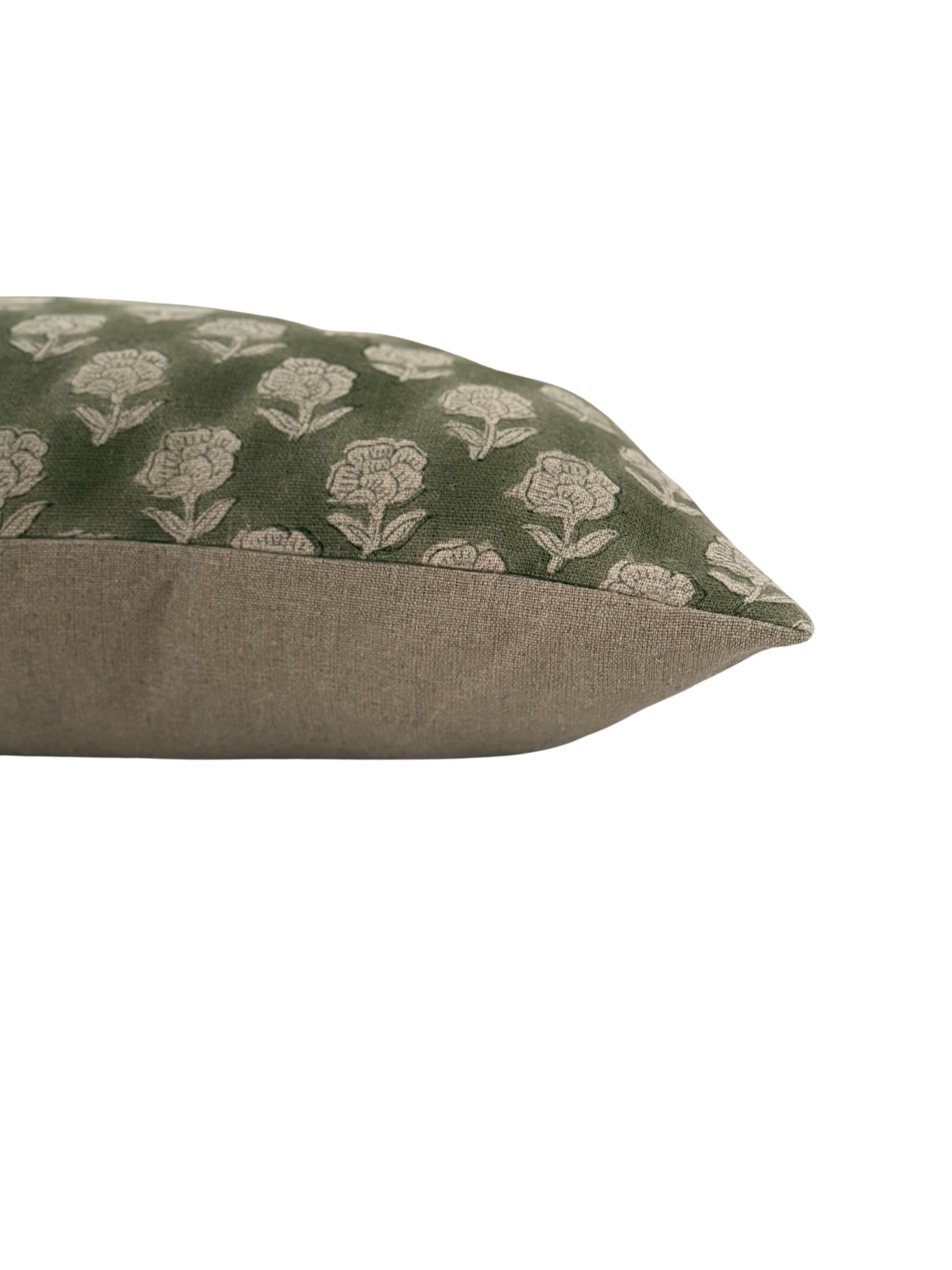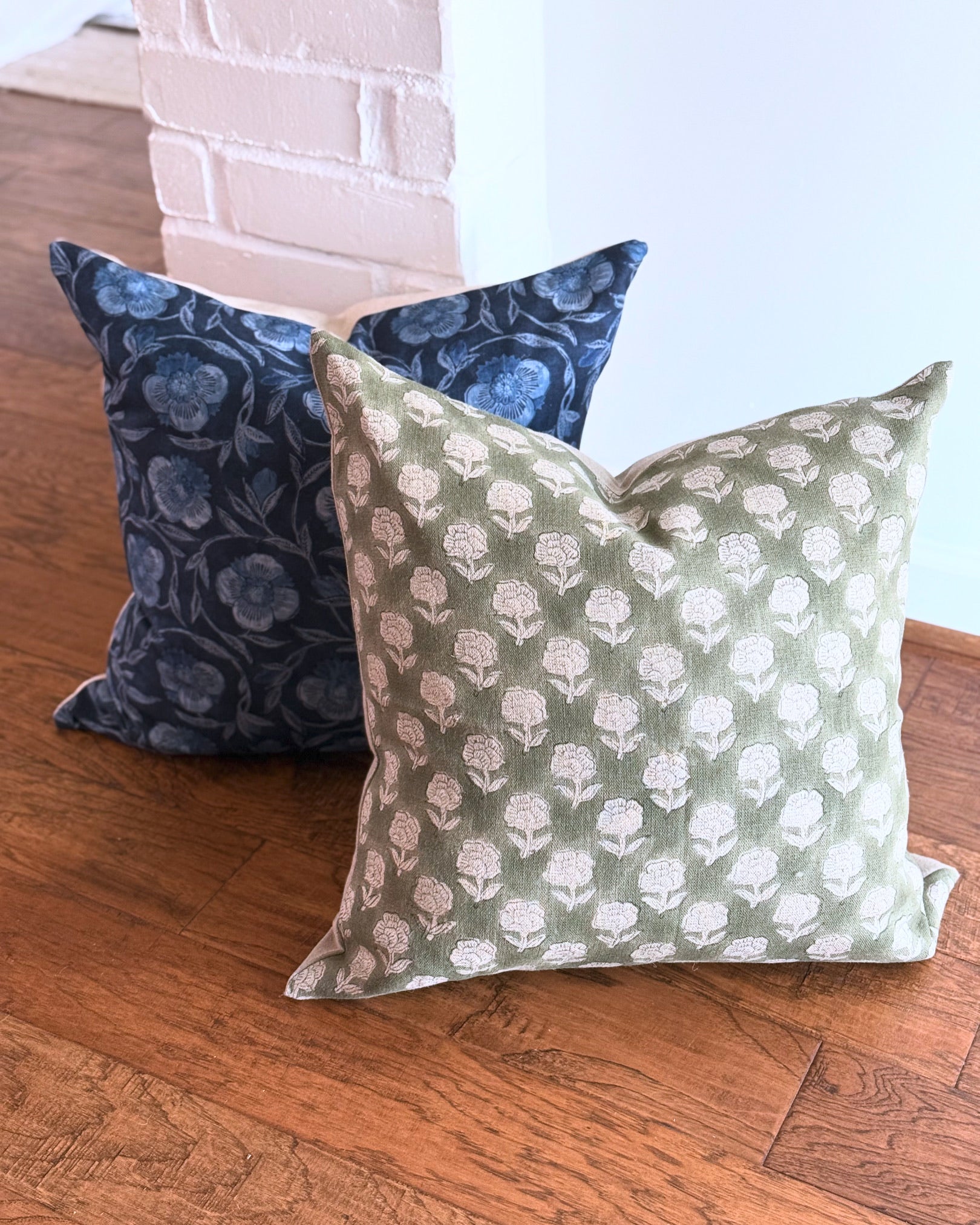 This fabric features a green block print design. It is meticulously handcrafted with a high-quality linen blend fabric and a natural linen backing. Invisible zipper, serged edges.